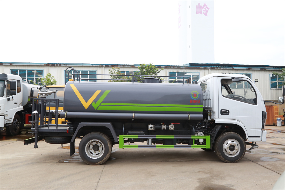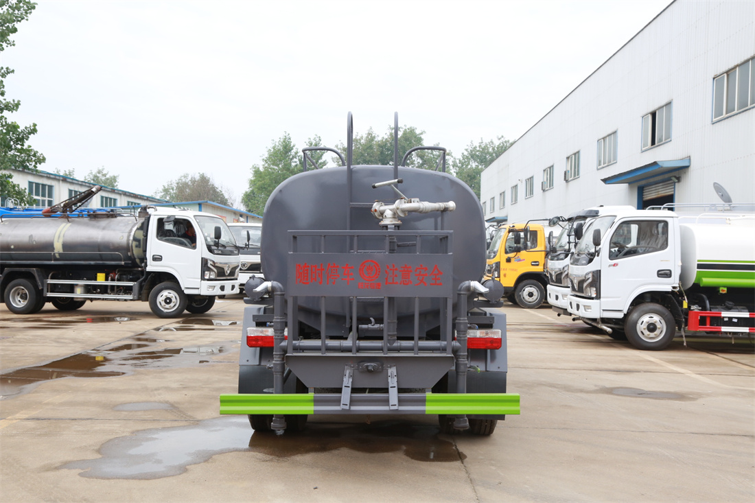 灑水車前裝有鴨形噴嘴或圓頭沖嘴,后面裝有圓柱開灑水噴嘴或蓮蓬頭噴嘴,后部有一工作平臺(tái),裝配有水炮。后部還可裝8個(gè)噴嘴(選裝)。