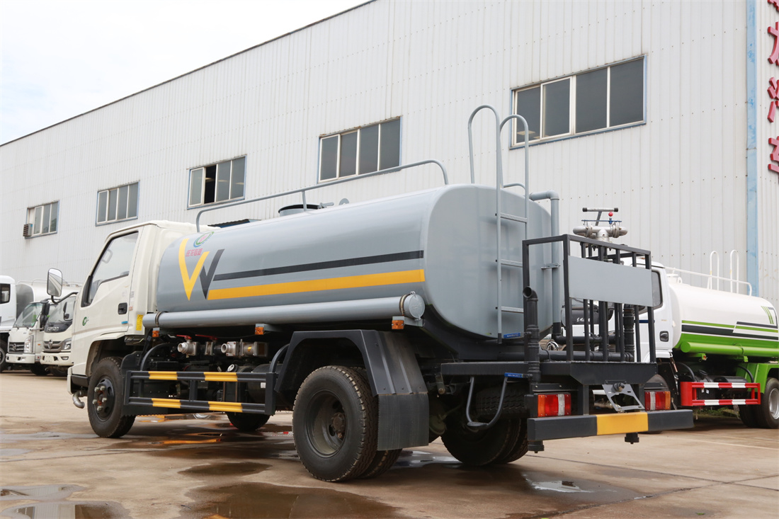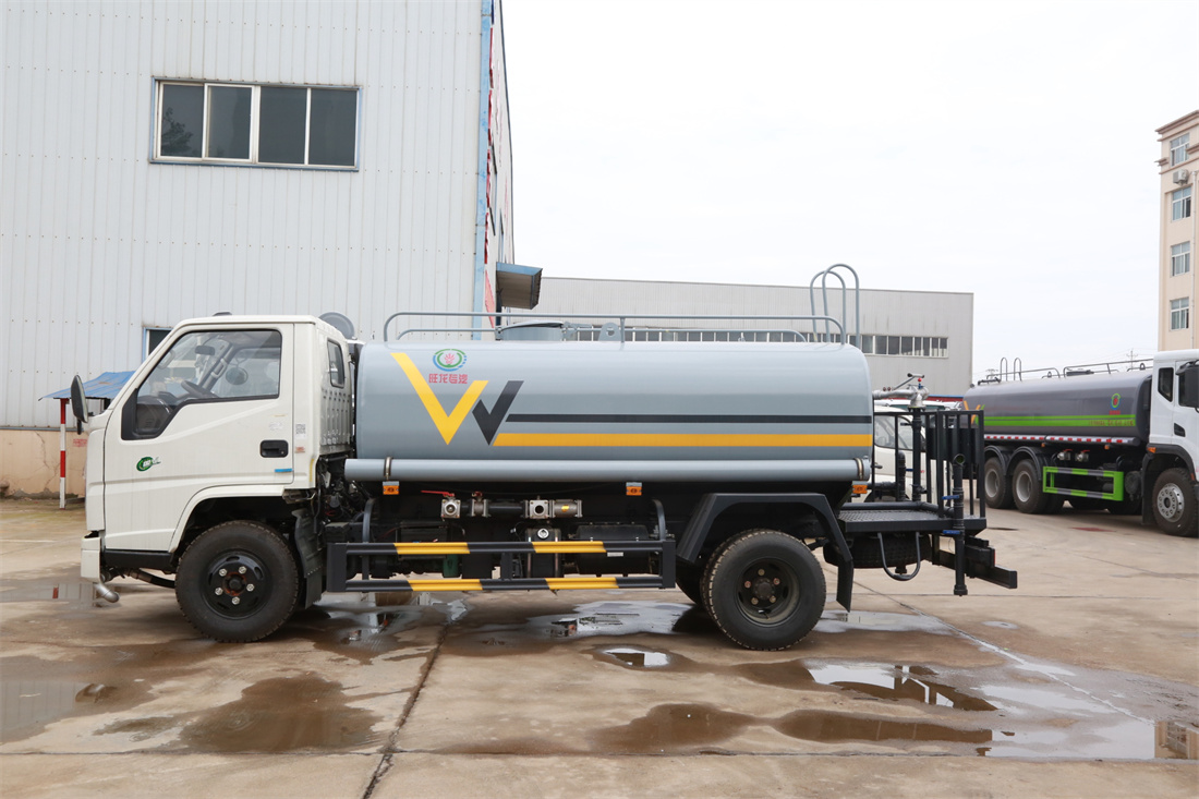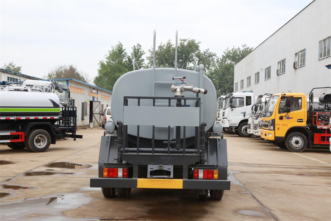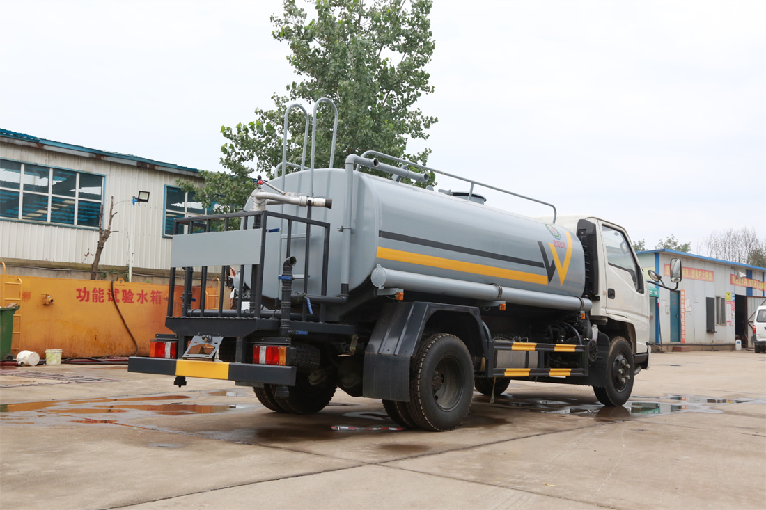 灑水車前裝有鴨形噴嘴或圓頭沖嘴,后面裝有圓柱開灑水噴嘴或蓮蓬頭噴嘴,后部有一工作平臺(tái),裝配有水炮。后部還可裝8個(gè)噴嘴(選裝)。