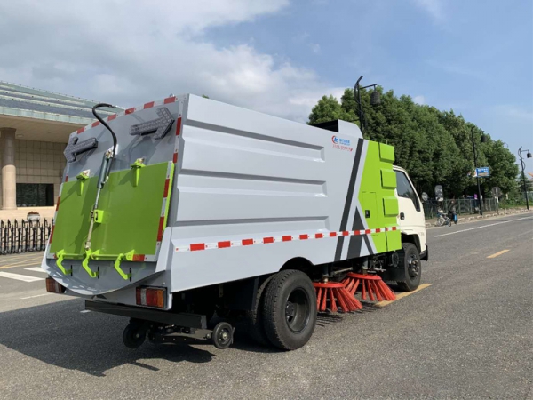 1.采用吸掃混合的方式收集垃圾,濕式除塵、電液,液壓傾翻卸料的作業(yè)方式對路面進(jìn)行清掃作業(yè)。