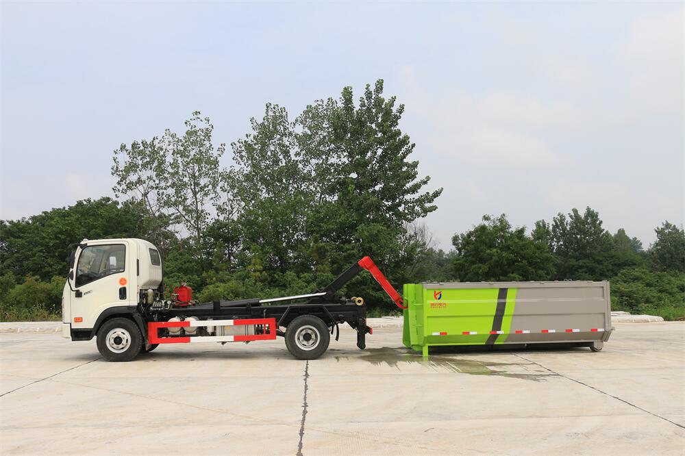 勾臂式垃圾車(車廂可卸式垃圾車)介紹: 車廂可卸式垃圾車又叫拉臂式垃圾車,是一種采用高新設(shè)計(jì)可伸縮的鉤臂,實(shí)現(xiàn)垃圾廂的二次吊裝,自吊上放下,可自行傾倒垃圾的環(huán)衛(wèi)設(shè)備。 拉臂式垃圾車結(jié)構(gòu)簡(jiǎn)單,操作穩(wěn)定方便,裝卸效率高,機(jī)械化程度高,節(jié)省人力。鉤臂垃圾車一車可帶多個(gè)垃圾廂,在裝卸的運(yùn)輸過程中可有效地避免二次污染。 拉臂垃圾車采用高新設(shè)計(jì)可擺動(dòng)的鉤臂,垃圾箱由框架、開啟油缸、滑輪、后門和若干加強(qiáng)框架與鋼板焊接而成。調(diào)換貨廂快捷方便,貨廂上帶蓋(倒垃圾時(shí)可翻開),鉤臂垃圾車?yán)鴰w可選用碳鋼、不銹鋼材質(zhì)、內(nèi)部采取環(huán)氧樹脂防腐處理,改裝部分與原車底盤為可分離式,維修方便且保持了原車的機(jī)動(dòng)性及行駛性能。