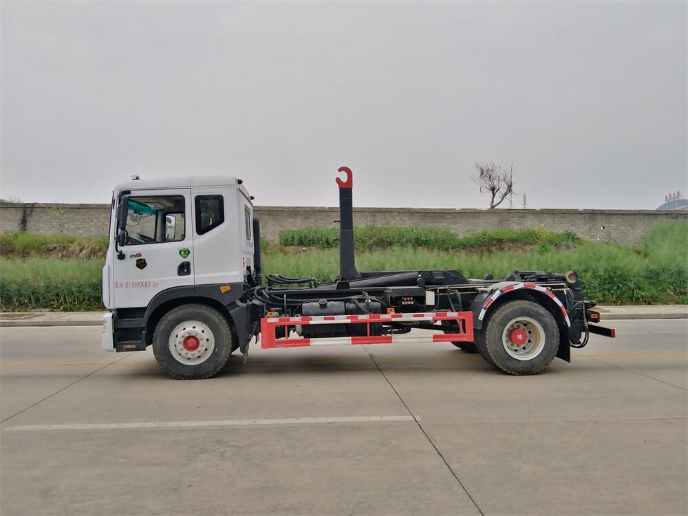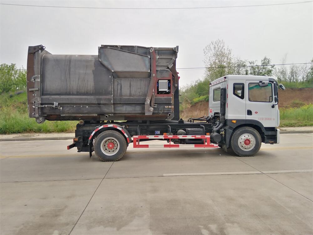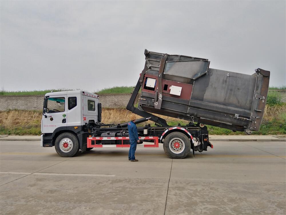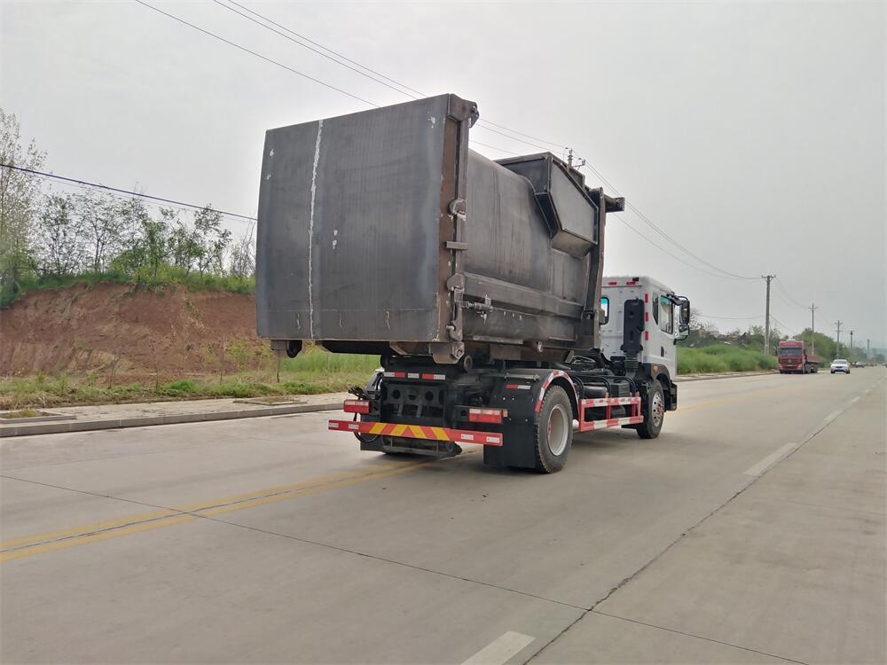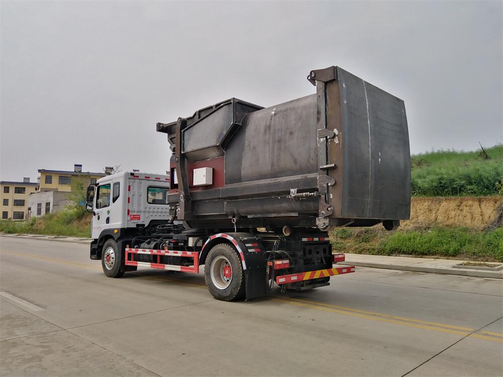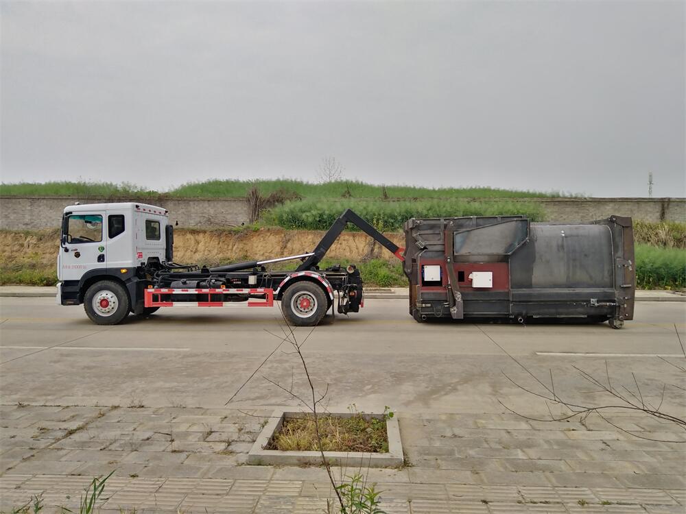 勾臂式垃圾車(車廂可卸式垃圾車)介紹: 車廂可卸式垃圾車又叫拉臂式垃圾車,是一種采用高新設計可伸縮的鉤臂,實現(xiàn)垃圾廂的二次吊裝,自吊上放下,可自行傾倒垃圾的環(huán)衛(wèi)設備。 拉臂式垃圾車結構簡單,操作穩(wěn)定方便,裝卸效率高,機械化程度高,節(jié)省人力。鉤臂垃圾車一車可帶多個垃圾廂,在裝卸的運輸過程中可有效地避免二次污染。 拉臂垃圾車采用高新設計可擺動的鉤臂,垃圾箱由框架、開啟油缸、滑輪、后門和若干加強框架與鋼板焊接而成。調(diào)換貨廂快捷方便,貨廂上帶蓋(倒垃圾時可翻開),鉤臂垃圾車垃圾廂體可選用碳鋼、不銹鋼材質(zhì)、內(nèi)部采取環(huán)氧樹脂防腐處理,改裝部分與原車底盤為可分離式,維修方便且保持了原車的機動性及行駛性能。