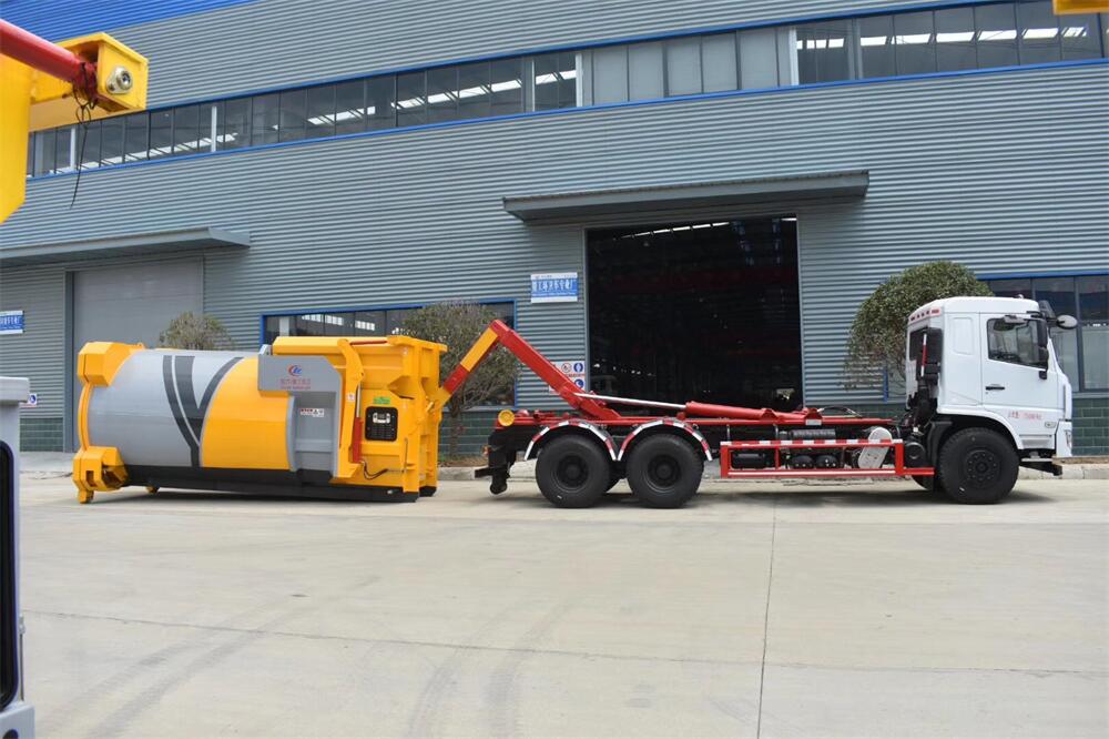 勾臂式垃圾車(車廂可卸式垃圾車)介紹: 車廂可卸式垃圾車又叫拉臂式垃圾車,是一種采用高新設計可伸縮的鉤臂,實現(xiàn)垃圾廂的二次吊裝,自吊上放下,可自行傾倒垃圾的環(huán)衛(wèi)設備。 拉臂式垃圾車結(jié)構(gòu)簡單,操作穩(wěn)定方便,裝卸效率高,機械化程度高,節(jié)省人力。鉤臂垃圾車一車可帶多個垃圾廂,在裝卸的運輸過程中可有效地避免二次污染。 拉臂垃圾車采用高新設計可擺動的鉤臂,垃圾箱由框架、開啟油缸、滑輪、后門和若干加強框架與鋼板焊接而成。調(diào)換貨廂快捷方便,貨廂上帶蓋(倒垃圾時可翻開),鉤臂垃圾車垃圾廂體可選用碳鋼、不銹鋼材質(zhì)、內(nèi)部采取環(huán)氧樹脂防腐處理,改裝部分與原車底盤為可分離式,維修方便且保持了原車的機動性及行駛性能。