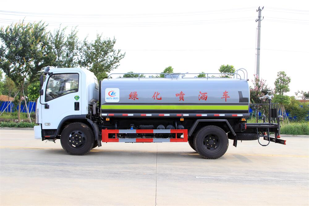 灑水車前裝有鴨形噴嘴或圓頭沖嘴,后面裝有圓柱開灑水噴嘴或蓮蓬頭噴嘴,后部有一工作平臺,裝配有水炮。后部還可裝8個噴嘴(選裝)。
