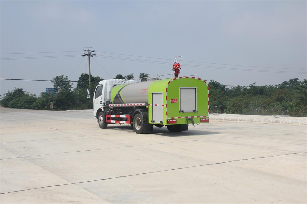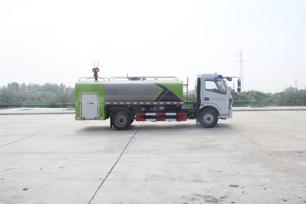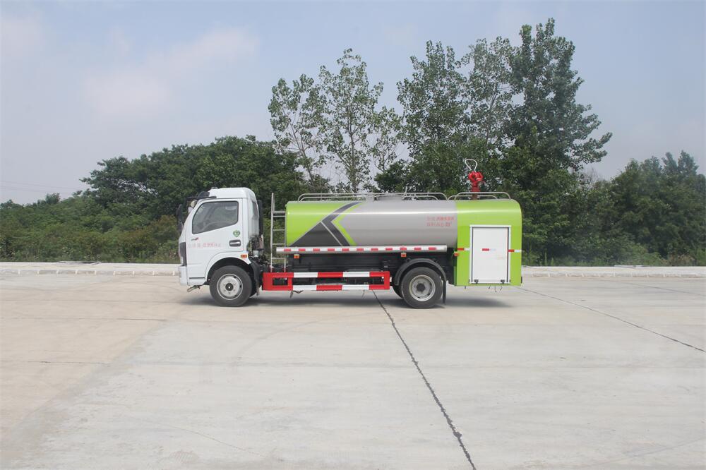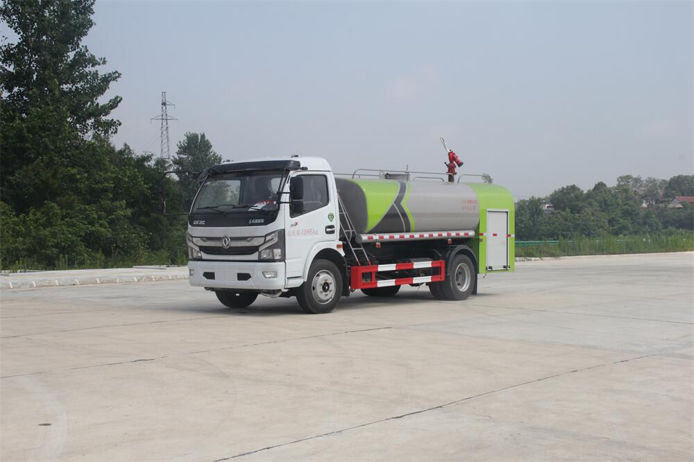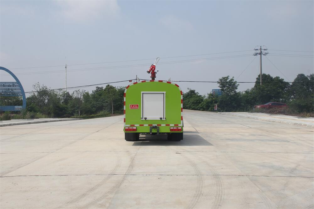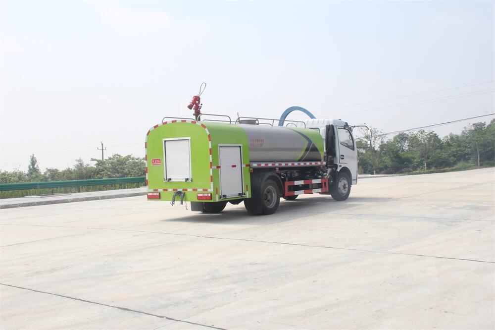 灑水車前裝有鴨形噴嘴或圓頭沖嘴,后面裝有圓柱開(kāi)灑水噴嘴或蓮蓬頭噴嘴,后部有一工作平臺(tái),裝配有水炮。后部還可裝8個(gè)噴嘴(選裝)。