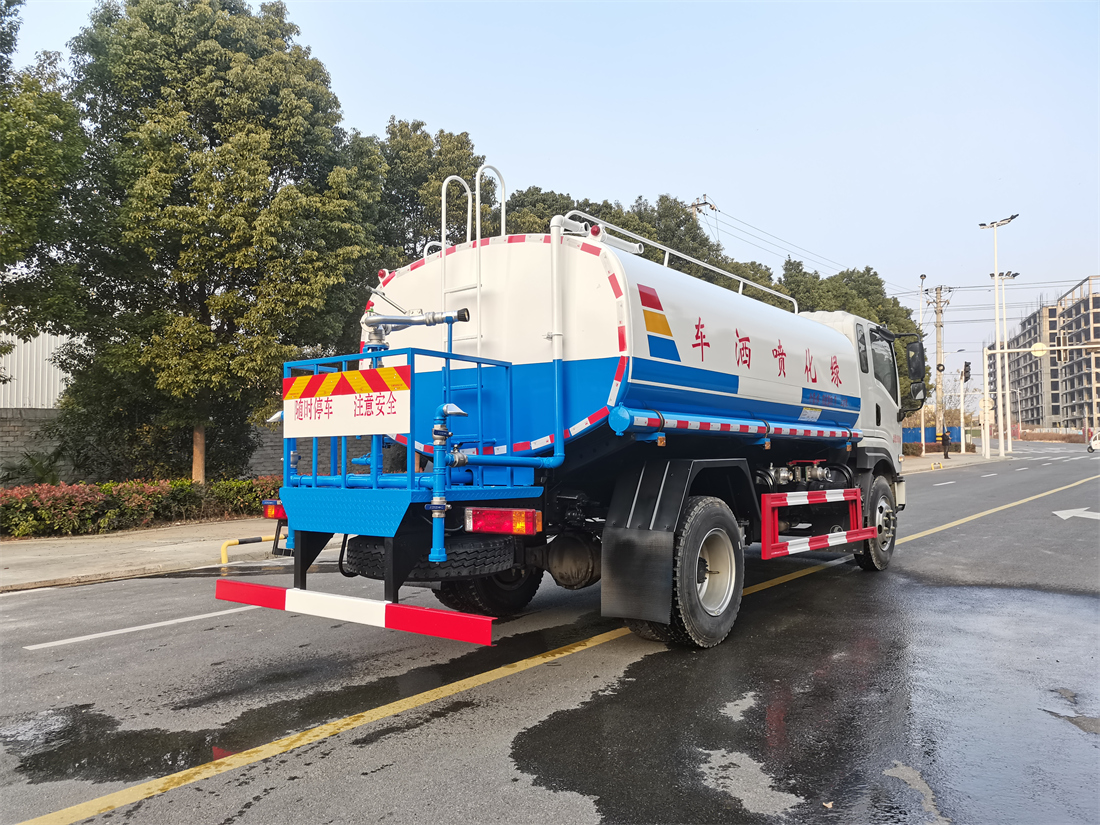 灑水車前裝有鴨形噴嘴或圓頭沖嘴,后面裝有圓柱開灑水噴嘴或蓮蓬頭噴嘴,后部有一工作平臺(tái),裝配有水炮。后部還可裝8個(gè)噴嘴(選裝)。