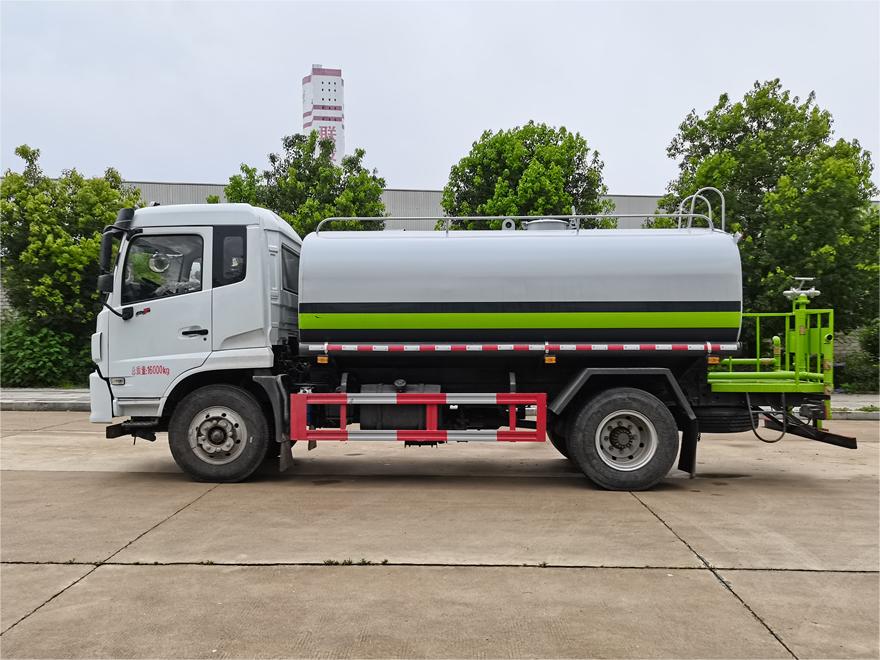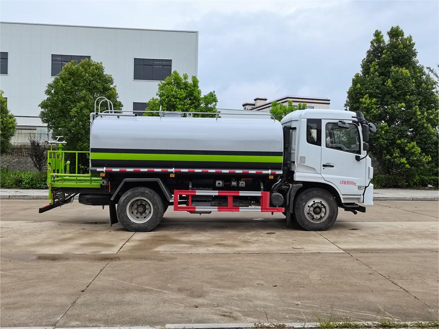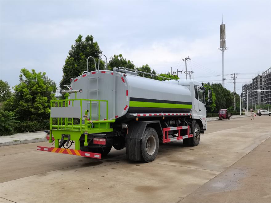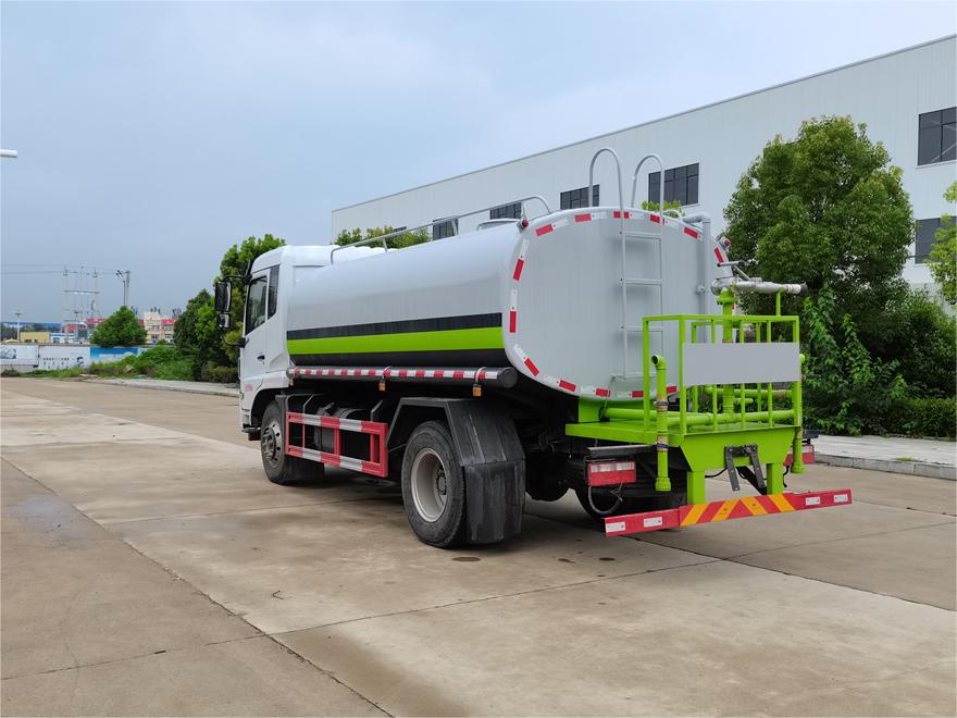 灑水車(chē)前裝有鴨形噴嘴或圓頭沖嘴,后面裝有圓柱開(kāi)灑水噴嘴或蓮蓬頭噴嘴,后部有一工作平臺(tái),裝配有水炮。后部還可裝8個(gè)噴嘴(選裝)。