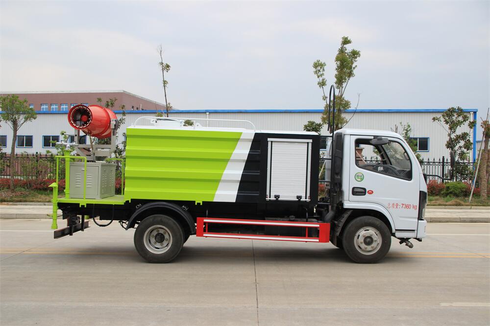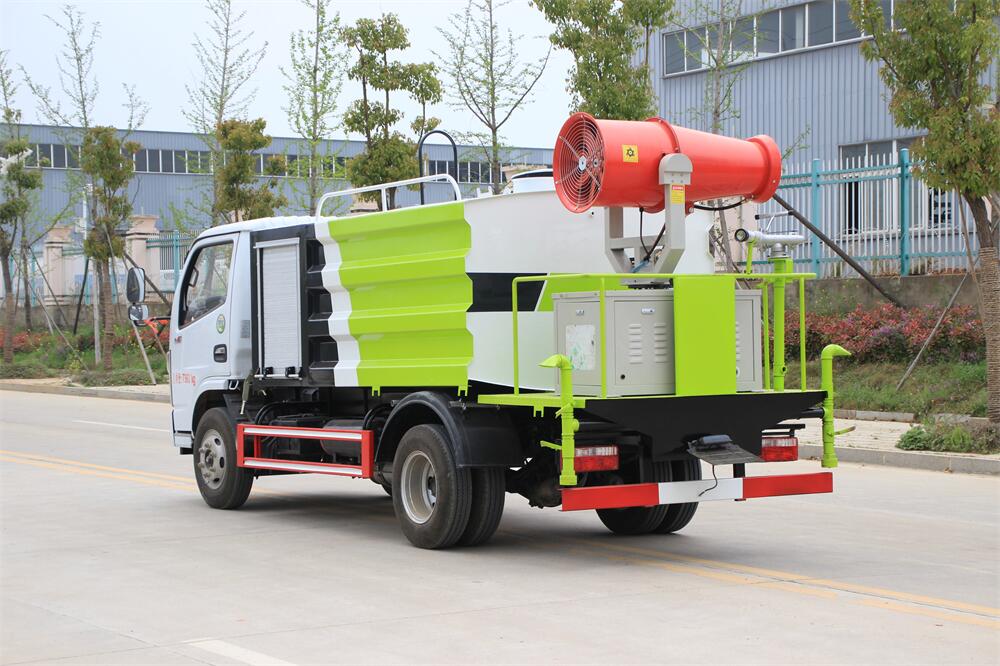 上裝配置:罐體容積為 5-7立方,選配風送式霧炮機組射程30米、40米、50米、60米、80米、100米、120米霧炮,罐體鋼板為4mm碳鋼Q235材質(zhì),罐內(nèi)隔板具有防波作用,以減輕汽車行駛時罐體液體沖擊,罐體及整車外形尺寸按照公告。帶大功率專用灑水泵,泵可自吸自排,整車前沖、后灑、側(cè)噴、帶65消防接口,后平臺配CLW-50、CLW-60、CLW-80、CLW-100、CLW-120型風送式霧炮機組;罐體前封頭配大功率柴油發(fā)電機組;前封頭帶水位計,后平臺主管路帶1寸澆花接口,后爬梯。帶兩根輸水管及陰陽端。罐體顏色:銀/灰/綠,罐體兩側(cè)噴“多功能抑塵車”字樣,貼反光標示。
