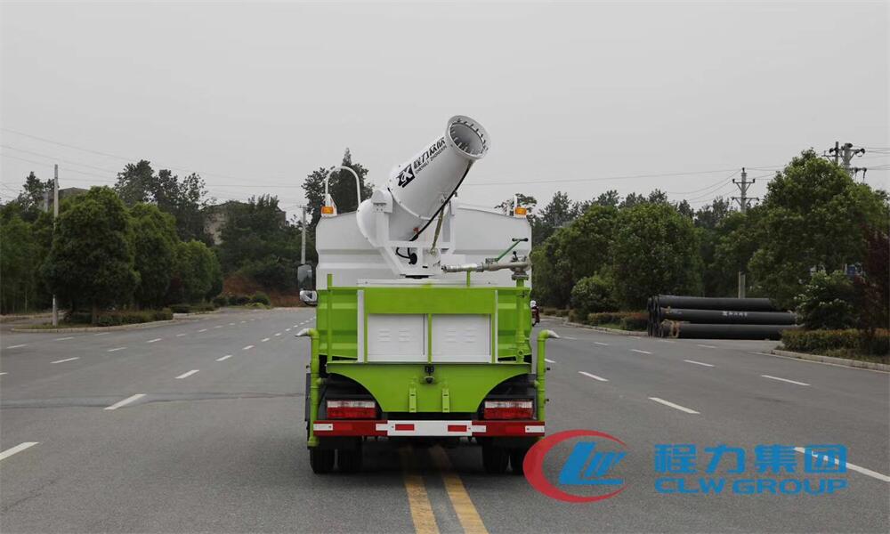 上裝配置:罐體容積為 5-7立方,選配風送式霧炮機組射程30米、40米、50米、60米、80米、100米、120米霧炮,罐體鋼板為4mm碳鋼Q235材質,罐內隔板具有防波作用,以減輕汽車行駛時罐體液體沖擊,罐體及整車外形尺寸按照公告。帶大功率專用灑水泵,泵可自吸自排,整車前沖、后灑、側噴、帶65消防接口,后平臺配CLW-50、CLW-60、CLW-80、CLW-100、CLW-120型風送式霧炮機組;罐體前封頭配大功率柴油發(fā)電機組;前封頭帶水位計,后平臺主管路帶1寸澆花接口,后爬梯。帶兩根輸水管及陰陽端。罐體顏色:銀/灰/綠,罐體兩側噴“多功能抑塵車”字樣,貼反光標示。