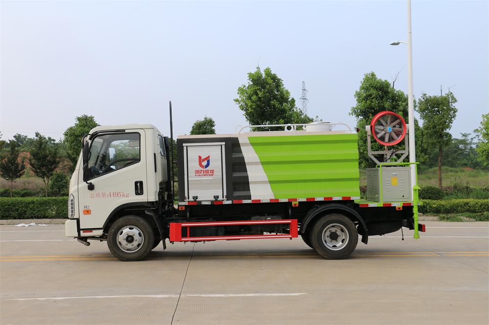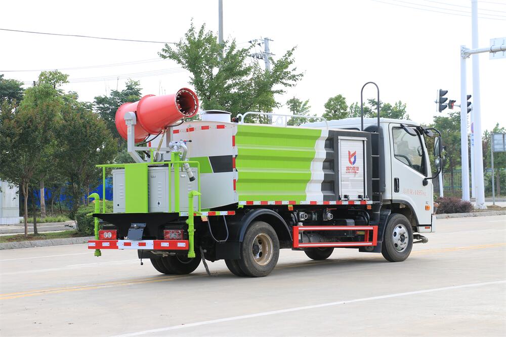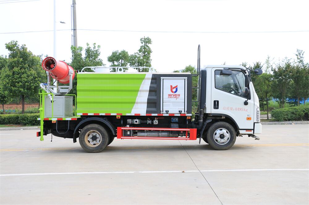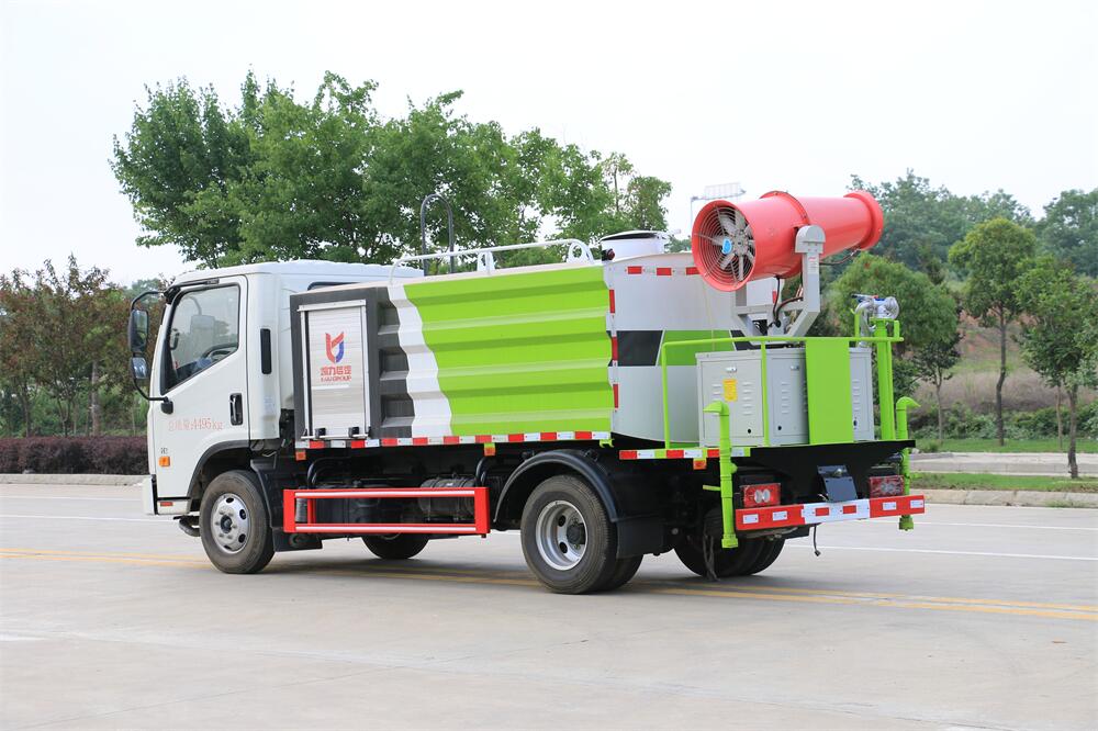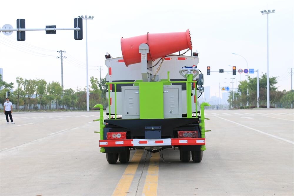 上裝配置:罐體容積為 5立方,選配風(fēng)送式霧炮機(jī)組射程30米、40米、50米、60米、80米、100米、120米霧炮,罐體鋼板為4mm碳鋼Q235材質(zhì),罐內(nèi)隔板具有防波作用,以減輕汽車(chē)行駛時(shí)罐體液體沖擊,罐體及整車(chē)外形尺寸按照公告。帶大功率專(zhuān)用灑水泵,泵可自吸自排,整車(chē)前沖、后灑、側(cè)噴、帶65消防接口,后平臺(tái)配CLW-50、CLW-60、CLW-80、CLW-100、CLW-120型風(fēng)送式霧炮機(jī)組;罐體前封頭配大功率柴油發(fā)電機(jī)組;前封頭帶水位計(jì),后平臺(tái)主管路帶1寸澆花接口,后爬梯。帶兩根輸水管及陰陽(yáng)端。罐體顏色:銀/灰/綠,罐體兩側(cè)噴“多功能抑塵車(chē)”字樣,貼反光標(biāo)示。