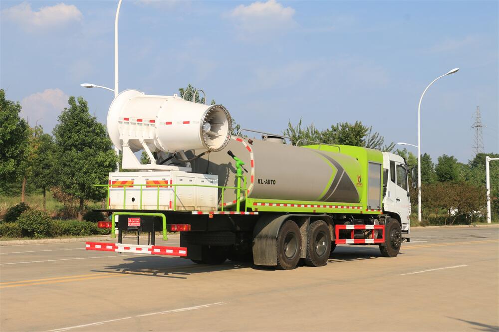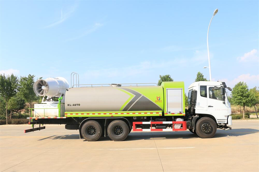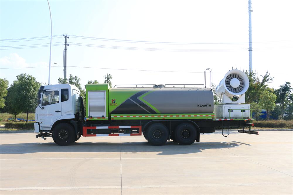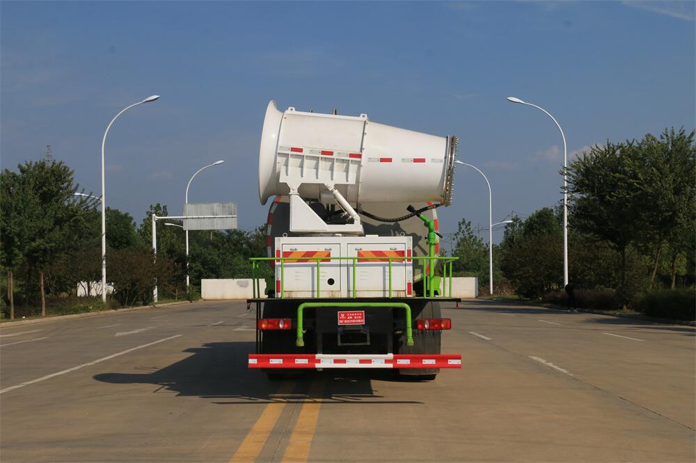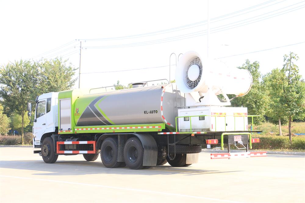 上裝配置:罐體容積為 16立方,選配風送式霧炮機組射程30米、40米、50米、60米、80米、100米、120米霧炮,罐體鋼板為4mm碳鋼Q235材質,罐內隔板具有防波作用,以減輕汽車行駛時罐體液體沖擊,罐體及整車外形尺寸按照公告。帶大功率專用灑水泵,泵可自吸自排,整車前沖、后灑、側噴、帶65消防接口,后平臺配CLW-50、CLW-60、CLW-80、CLW-100、CLW-120型風送式霧炮機組;罐體前封頭配大功率柴油發(fā)電機組;前封頭帶水位計,后平臺主管路帶1寸澆花接口,后爬梯。帶兩根輸水管及陰陽端。罐體顏色:銀/灰/綠,罐體兩側噴“多功能抑塵車”字樣,貼反光標示。
