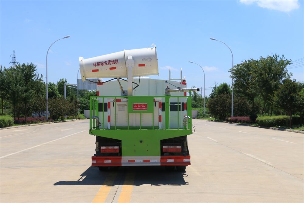 上裝配置:罐體容積為 16立方,選配風(fēng)送式霧炮機(jī)組射程30米、40米、50米、60米、80米、100米、120米霧炮,罐體鋼板為4mm碳鋼Q235材質(zhì),罐內(nèi)隔板具有防波作用,以減輕汽車行駛時(shí)罐體液體沖擊,罐體及整車外形尺寸按照公告。帶大功率專用灑水泵,泵可自吸自排,整車前沖、后灑、側(cè)噴、帶65消防接口,后平臺(tái)配CLW-50、CLW-60、CLW-80、CLW-100、CLW-120型風(fēng)送式霧炮機(jī)組;罐體前封頭配大功率柴油發(fā)電機(jī)組;前封頭帶水位計(jì),后平臺(tái)主管路帶1寸澆花接口,后爬梯。帶兩根輸水管及陰陽(yáng)端。罐體顏色:銀/灰/綠,罐體兩側(cè)噴“多功能抑塵車”字樣,貼反光標(biāo)示。